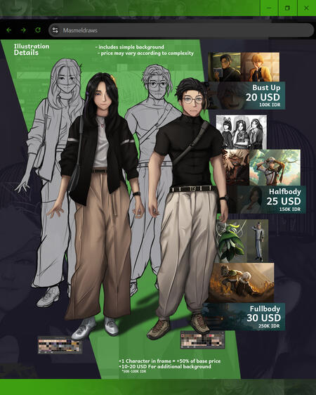 Splash Art : $40 USD / 320K IDR (+Additional character +$20 USD / 100K IDR), price may vary according to complexity