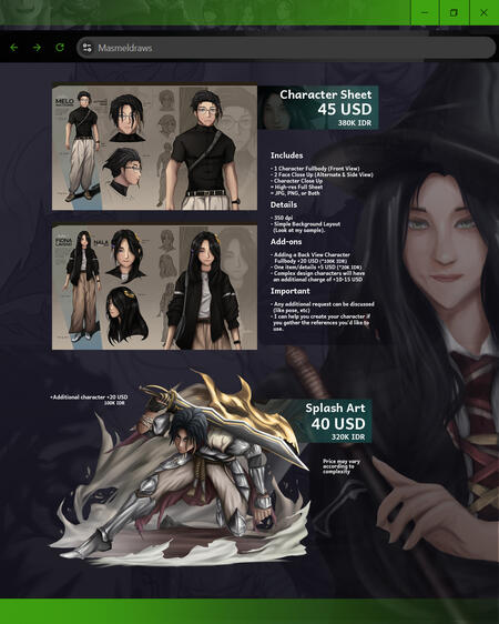 Splash Art : $40 USD / 320K IDR (+Additional character +$20 USD / 100K IDR), price may vary according to complexity